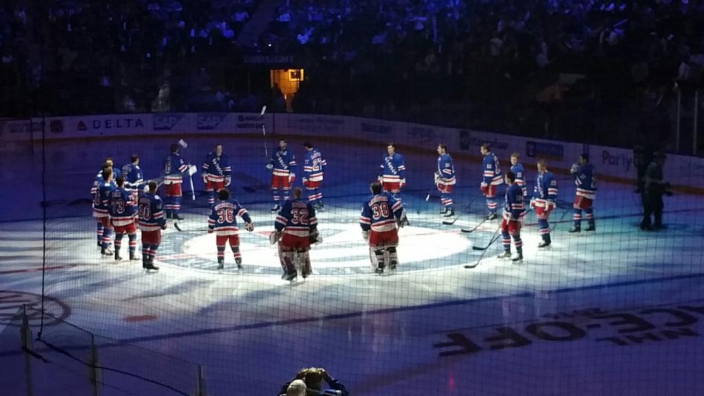 The Rangers home opener came with a blue carpet pre-game spectacular starting mid-afternoon. Eddie and I got there maybe an hour before the game and still caught a few of the old players walking through and being interviewed. There was a lot of waiting around, but also a lot of excitement. When the sun started setting, I started to get chilly, so we decided to find one of the new entrances to the Garden to go inside since we'd come outside.